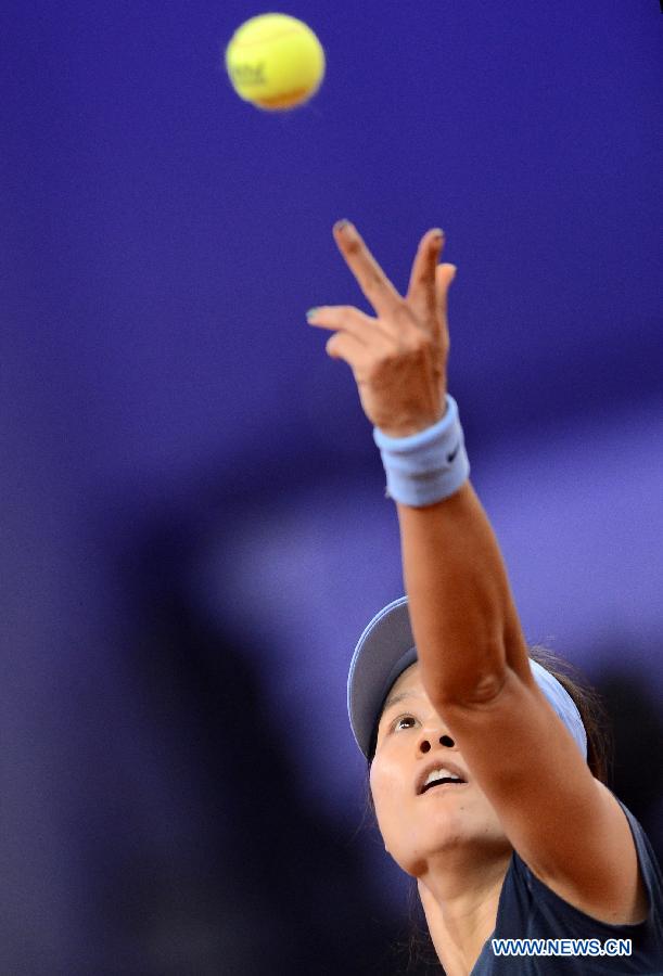 Li Na of China serves during her second round match of Porsche Tennis Grand Prix against Mirjana Lucic-Baroni of Croatia in Stuttgart, Germany, on April 24, 2013. Li Na won 2-0.(Xinhua/Ma Ning)