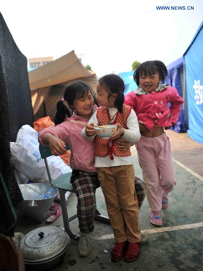Girls eat breakfast at a temporary settlement for quake-affected people in Lushan Middle School in Lushan County, southwest China's Sichuan Province, April 26, 2013. A 7.0-magnitude jolted Lushan County on April 20. (Xinhua/Li Wen)