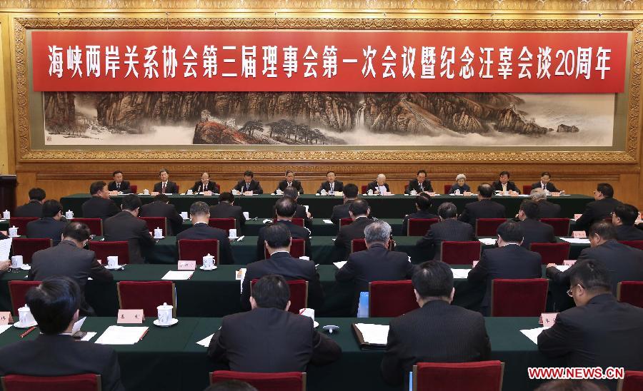 A council meeting of the mainland-based Association for Relations Across the Taiwan Straits(ARATS) is held in Beijing, capital of China, April 26, 2013. The meeting also marked the 20th anniversary of the historic "Wang-Koo meeting." In April 1993, ARATS President Wang Daohan and the Taiwan-based Straits Exchange Foundation (SEF) Chairman Koo Chen-fu held the "Wang-Koo meeting" in Singapore. It was the first public meeting between leaders of the two organizations. (Xinhua/Pang Xinglei)