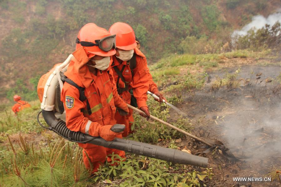 Firefighters fight against a forest fire in Qinfeng Township of Lufeng County, southwest China's Yunnan Province, April 26, 2013. Over 2,200 firefighters and service men have been mobilized to fight against a forest fire which broke out at around 16:00 (0800 GMT) on April 23. As of 16 p.m. on Friday, part of the burning area have been under control. (Xinhua/Xu Tao)
