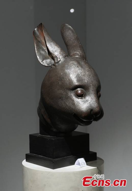 The file photo taken on Feb. 21, 2009 shows the Chinese bronze rabbit head sculpture displayed at the Grand Palais in Paris. The family of French luxury goods retailer Pinault announced Friday in Beijing that it will donate two pieces of Chinese cultural relics looted by Anglo-French allied forces during the Second Opium War in 1860, including the rat head, back to China. [Photo: agencies]