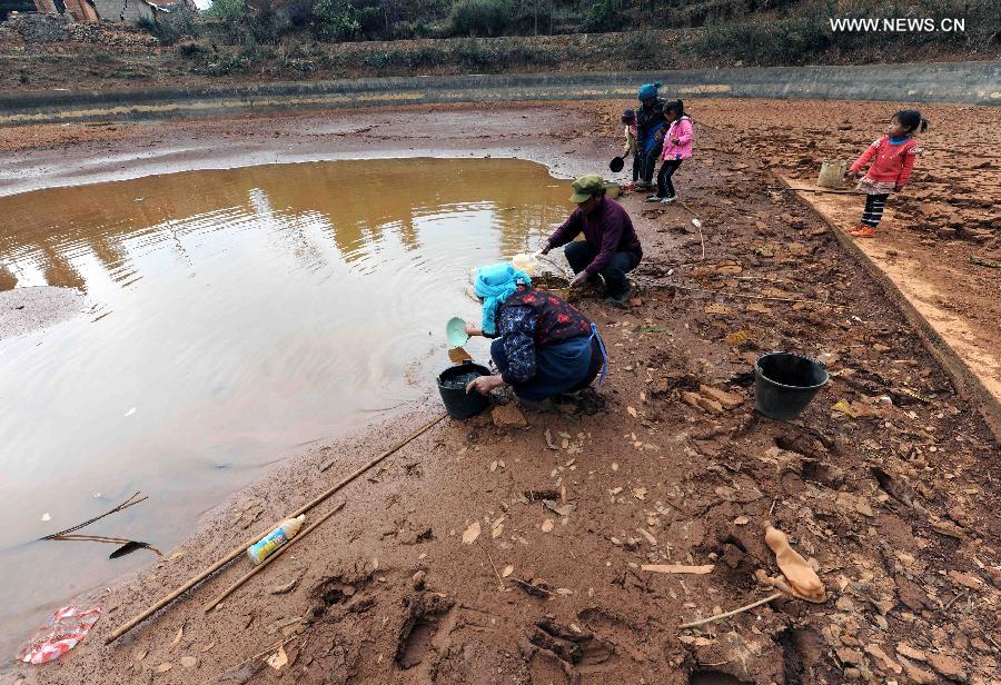 Villagers fetch water at a pond which is going dry in Duomaga Village of Kunming City, capital of southwest China's Yunnan Province, March 26, 2013. Over 12 million people were affected by the lingering drought in the province. (Xinhua/Yang Zongyou)