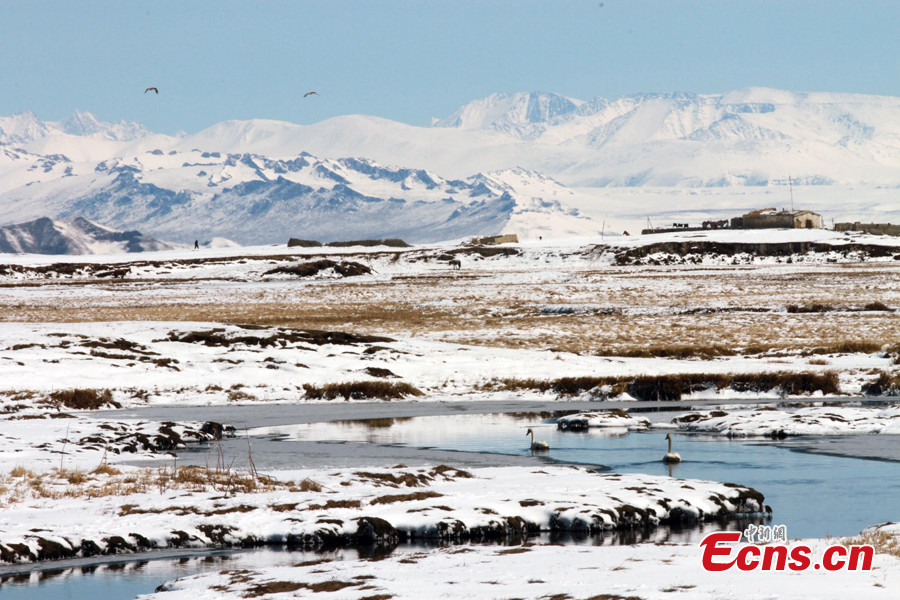 Swans swim on a river in Bayanblak Wetlands in Hejing County, Northwest China's Xinjiang Uyghur Autonomous Region. The Bayanblak Wetlands turned into a wonderland in spring as herdsmen and wildlife live in harmony with nature. [Photo: CNS]