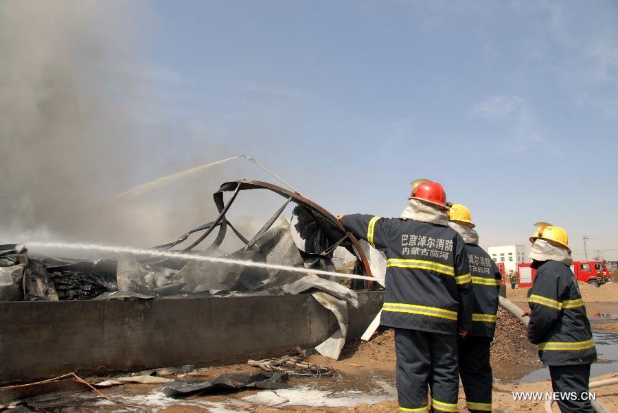 Firefighters work to extinguish the fire at the Dezheng Chemical Plant in Dengkou County, north China's Inner Mongolia Autonomous Region, April 27, 2013. A fire erupted in the chemical plant on Saturday morning. No casualties have been reported so far, and the plant workers and nearby residents have been relocated to safety.(Xinhua/Liu Suolin)