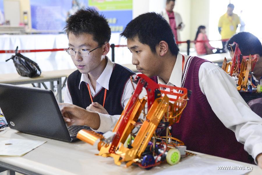 Local middle school students test a robot prior to their turn during a robot competition in Karamay, northwest China's Xinjiang Uygur Autonomous Region, April 27, 2013. Over 200 competitors in Xinjiang took part in the robot competition held here on Saturday. (Xinhua/Wang Fei)