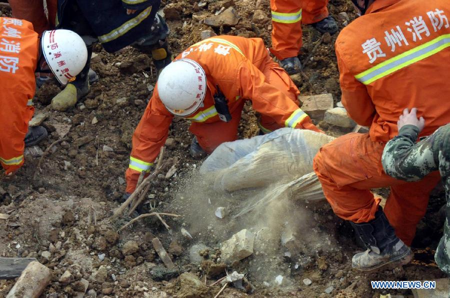 Rescuers work at the site of a landslide in Mawo Village near Bijie City, southwest China's Guizhou Province, April 27, 2013. Four villagers are confirmed dead and four others are missing after the landslide hit the village at 12:50 p.m. on April 27. (Xinhua/Luo Ji)