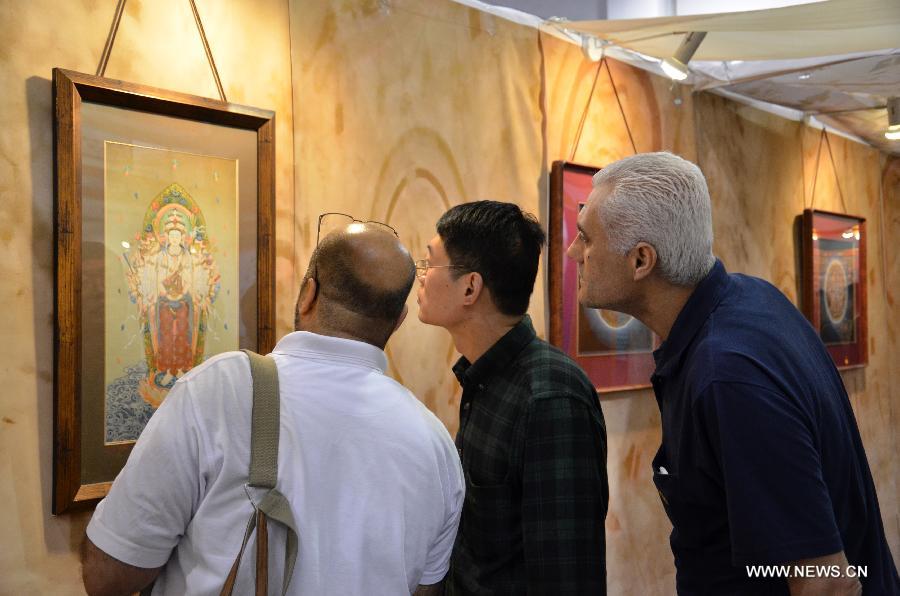 Domestic and foreign visitors look at paintings presented during the 8th China Yiwu Cultural Products Trade Fair in Yiwu, east China's Zhejiang Province, April 27, 2013. The four-day trade fair kicked off on Sunday. (Xinhua/Cao Dian)