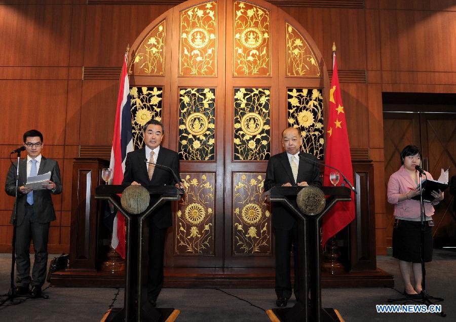 Thai Foreign Minister Surapong Tovichakchaikul (2nd R) and his Chinese counterpart Wang Yi (2nd L) attend a press conference in Bangkok, capital of Thailand, May 1, 2013. (Xinhua/Gao Jianjun)