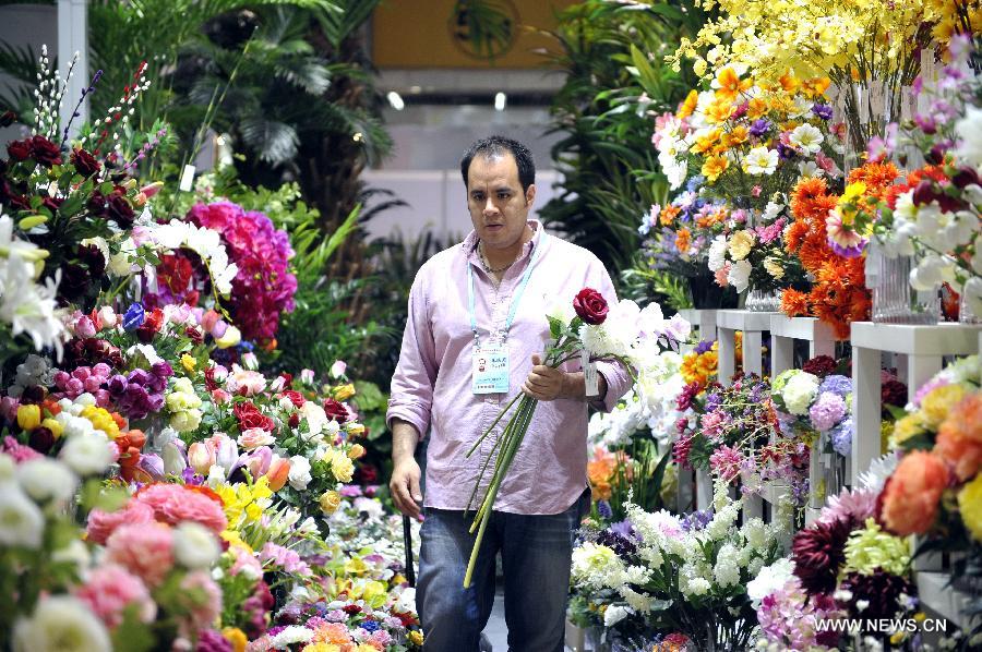 Rodrigo Quesada of Mexico purchases flowers at the 113th China Import and Export Fair, or Canton Fair, in Guangzhou, capital of south China's Guangdong Province, April 24, 2013. Nearly 25,000 companies, including 562 from 38 countries or regions are attending the fair, China's largest, attracting over 200,000 foreign buyers. (Xinhua/Liang Xu)