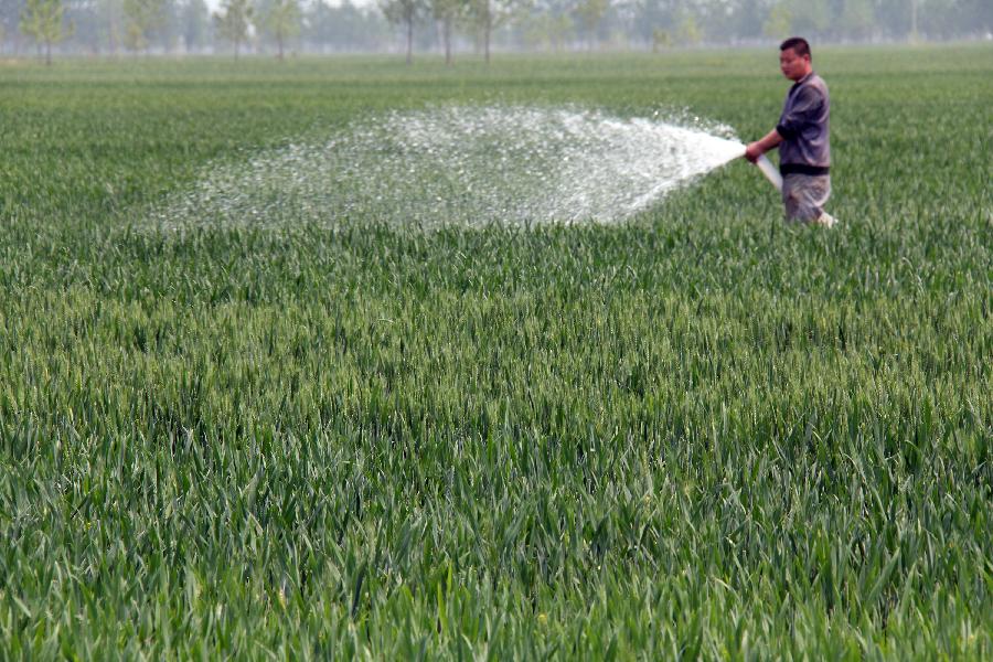 A farmer waters the crops in a farm land in Linyi of east China's Shandong Province, May 2, 2013. Farmers in Linyin were busy working in the farmlands in recent days tending the crops for a good harvest. (Xinhua/Zhang Chunlei)