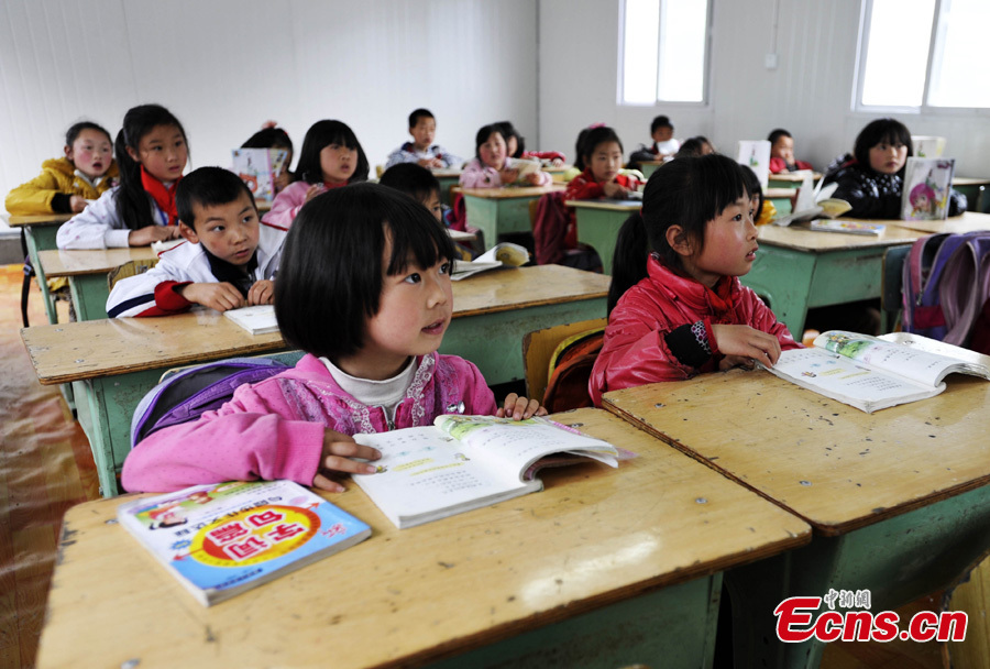 Students attend class in a prefabricated classroom in Taiping Township, Lushan County, Ya'an, Southwest China's Sichuan Province, May 2, 2013. The classrooms were built by the air force troops from the People's Liberation Army Chengdu Military Area Command. Over 2,000 students have resumed their classes in prefabricated houses. [Photo: CNS/An Yuan]