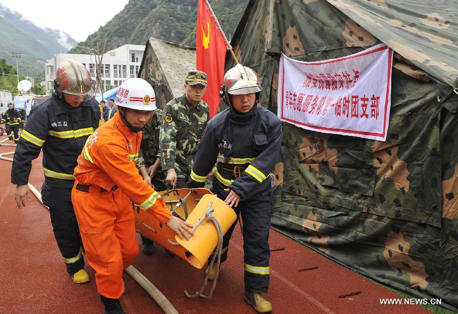 Fire fighters carry "an injured man" during a fire fighting drill held in a school playground in the quake-hit Baoxing County, southwest China's Sichuan Province, May 2, 2013. The school playground was served as the largest evacuation settlement for nearly 4,000 displaced people in Baoxing after the strong earthquake occurred in last month. (Xinhua/Lu Peng)