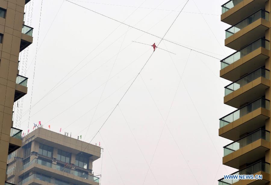 Tightrope walker completes 106-meter-high wire performance (1/5)