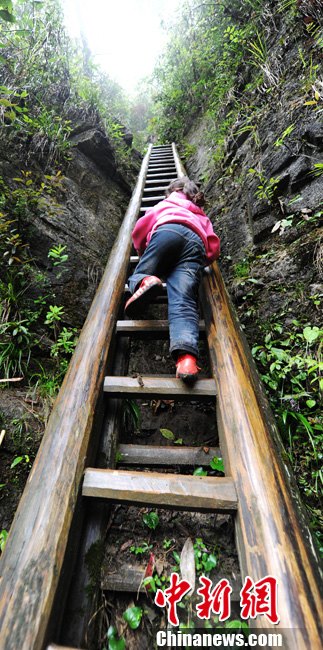 Zhangjiawan village is located on a remote mountain called “The Gate of Heaven” in central China's Hunan province, accessible only by ladders. The town was built hundreds of years ago to avoid bandits. Children here literally climb mountains to get to school. (Source: chinanews.com)