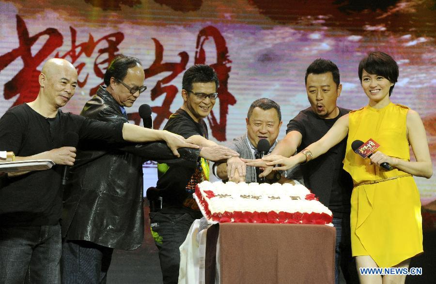 Actors celebrate for Eric Tsang's 60th birthday at the news conference held for the action movie "Seven Assassins" in Beijing, May 6, 2013. The movie is scheduled to be released on June 9. (Xinhua)