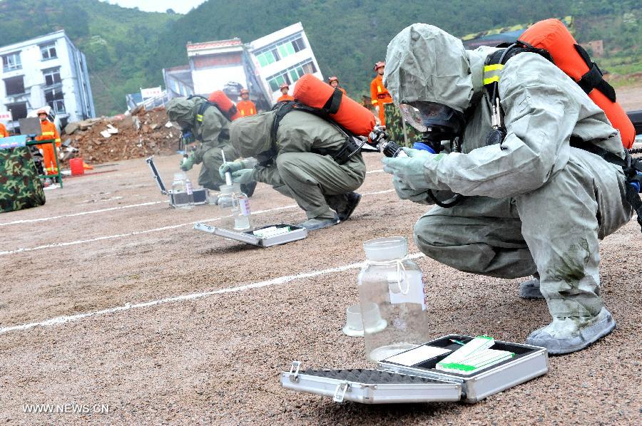 Rescuers detect the poisonous gas during an earthquake relief drill in Fuzhou, capital of southeast China's Fujian Province, May 8, 2013. About 270 rescuers from Shanghai municipality as well as Fujian, Jiangsu, Jiangxi, Anhui, Zhejiang provinces join the two-day drill. (Xinhua/Peng Zhangqing)