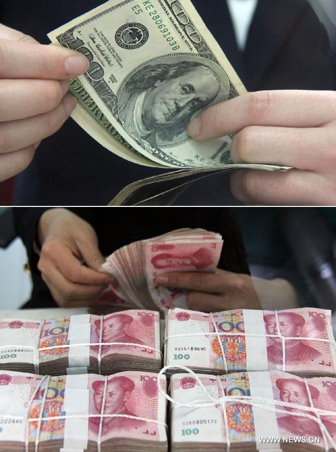 Combined photo taken on May 8, 2013 (upper) and April 11, 2013 (lower) shows workers counting U.S. dollar banknotes and Chinese currency Renminbi banknotes at a bank in Tancheng County of Linyi City, east China's Shandong Province. The Chinese currency Renminbi gained 103 basis points to 6.1980 against the U.S. dollar on Wednesday, according to the China Foreign Exchange Trading System. (Xinhua/Zhang Chunlei)