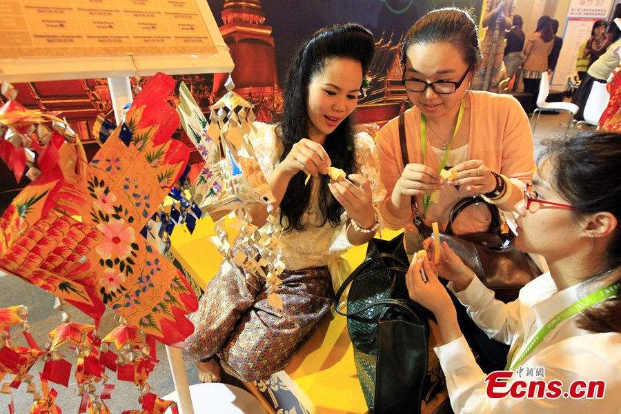 A Thai girl teaches visitors how to knit at the 10th World Travel Fair, which kicks off in Shanghai, May 9, 2013. [Photo: CNS/Pan Suofei]
