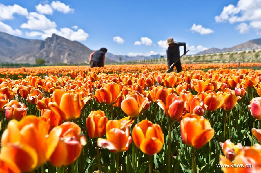 Villagers trim the tulip blossoms at a planting base in Qushui County, Lhasa City, capital of southwest China's Tibet Autonomous Region, May 9, 2013. The seed bulbs of tulip flowers were introduced into Lhasa from Yunnan Province. (Xinhua/Purbu Zhaxi)
