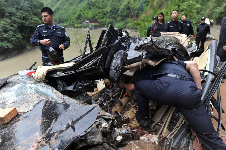 Policemen check a car destroyed by a landslide on S210 road from Lushan County to Baoxing County, southwest China's Sichuan Province, May 9, 2013. Three were killed among the nine people trapped by the landslide which took place Thursday near the epicenter of a 7.0-Magnitude earthquake that struck on April 20. (Xinhua/Hua Xiaofeng)