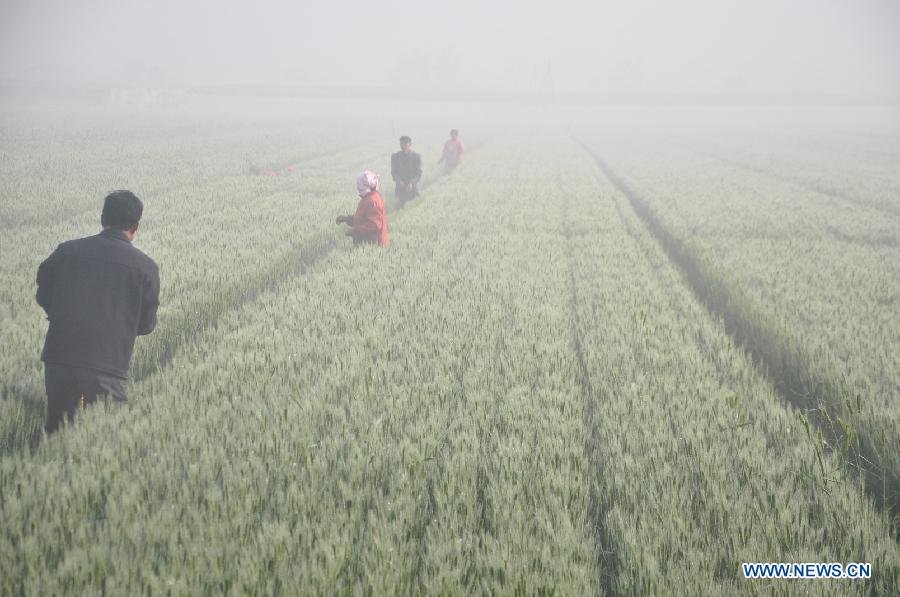 Farmers irrigate the wheat in heavy fog in Liaocheng City, east China's Shandong Province, May 10, 2013. (Xinhua/Zhao Yuguo)