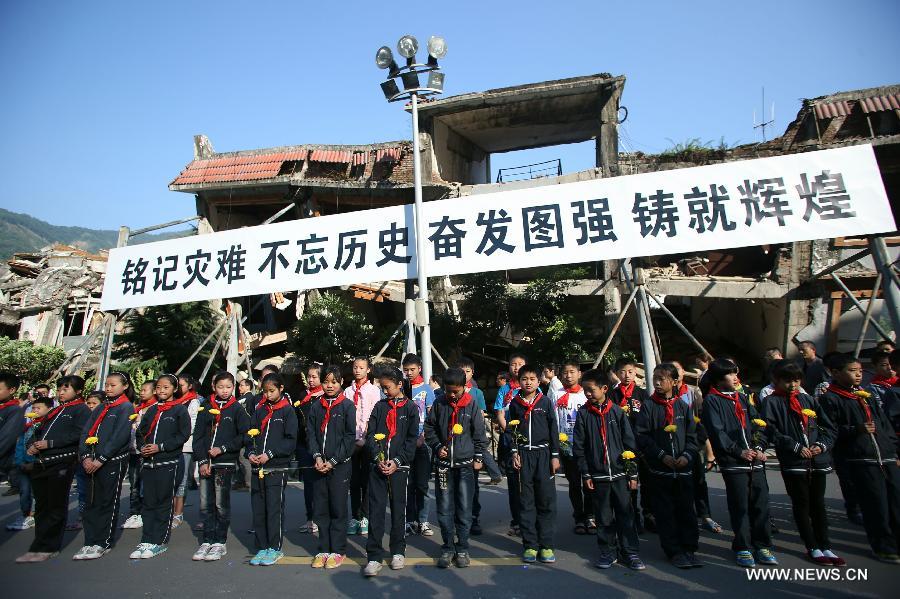 Pupils mourn for victims who died in a massive earthquake five years ago in the old county seat of Beichuan, southwest China's Sichuan Province, May 12, 2013. A memorial event was held in Beichuan on Sunday to mark the fifth anniversary of the deadly earthquake which havoced Sichuan on May 12, 2008. (Xinhua/Wang Shen)