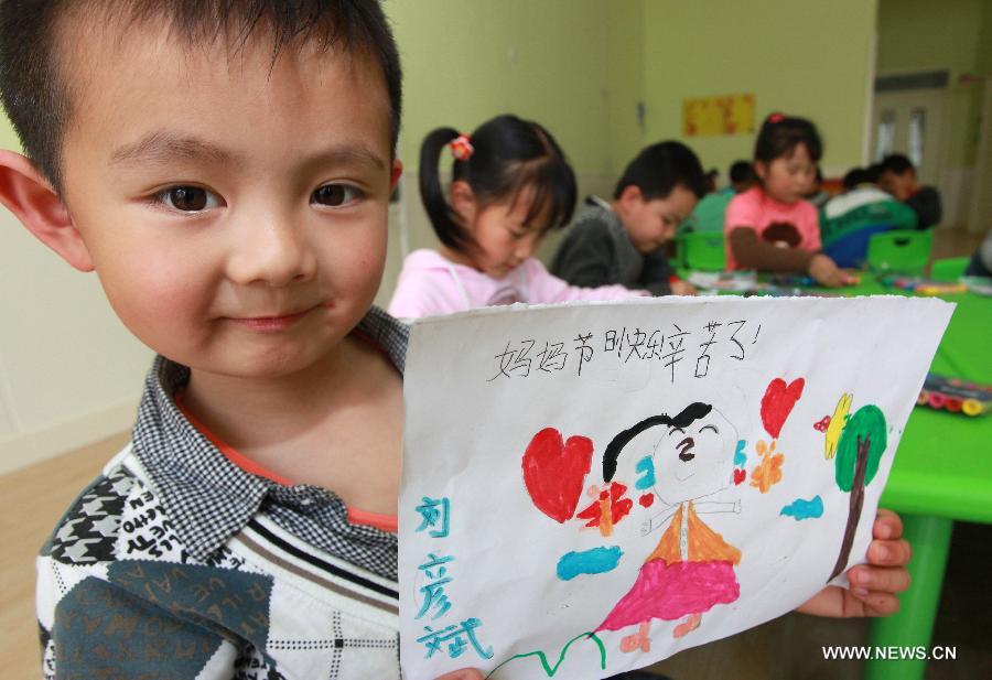 A little boy displays his drawing of his mother during a celebration of the Mother's Day in Jimo, east China's Shandong Province, May 12, 2013. (Xinhua/Liang Xiaopeng)
