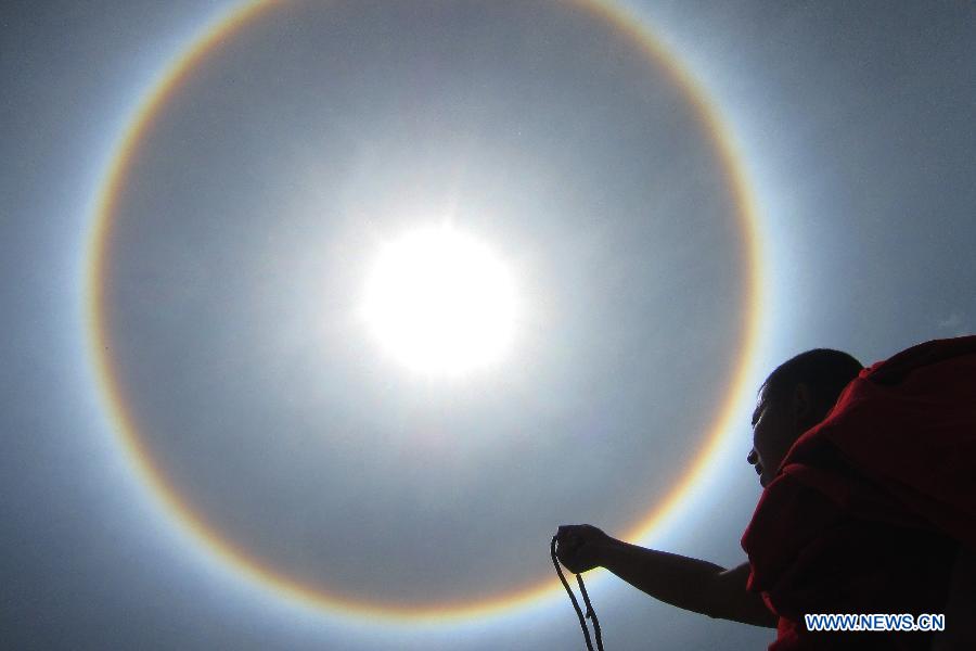 A monk looks at a solar halo occurring in Qamdo, southwest China's Tibet Autonomous Region, May 12, 2013. (Xinhua/Wen Tao)