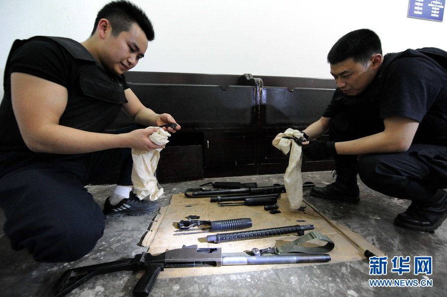 Armed cash transit security guards clean guns before starting an escort mission. (Xinhua Photo)