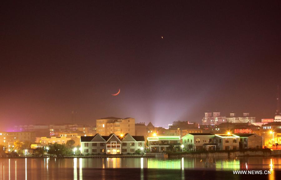 Picture taken on May 12, 2013 shows the planet Jupiter (R) next to the moon in the sky over Duchang County, east China's Jiangxi Province. The astronomical phenomena is rare to see when the Jupiter moves closest to the moon. (Xinhua/Fu Jianbin)