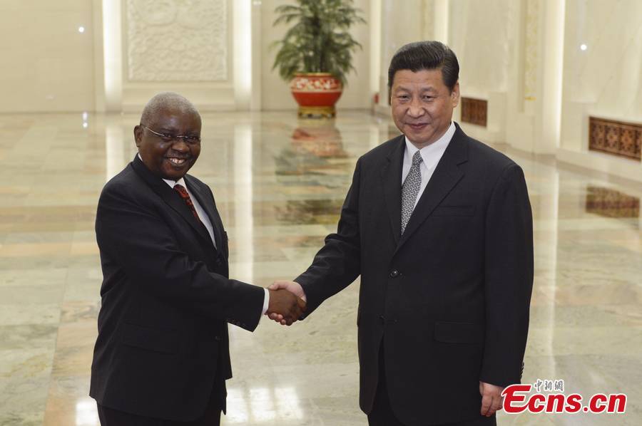 Chinese President Xi Jinping meets Mozambique's President Armando Guebuza at the Great Hall of the People in Beijing, May 13, 2013. [CNS Photo/Liao Pan]
