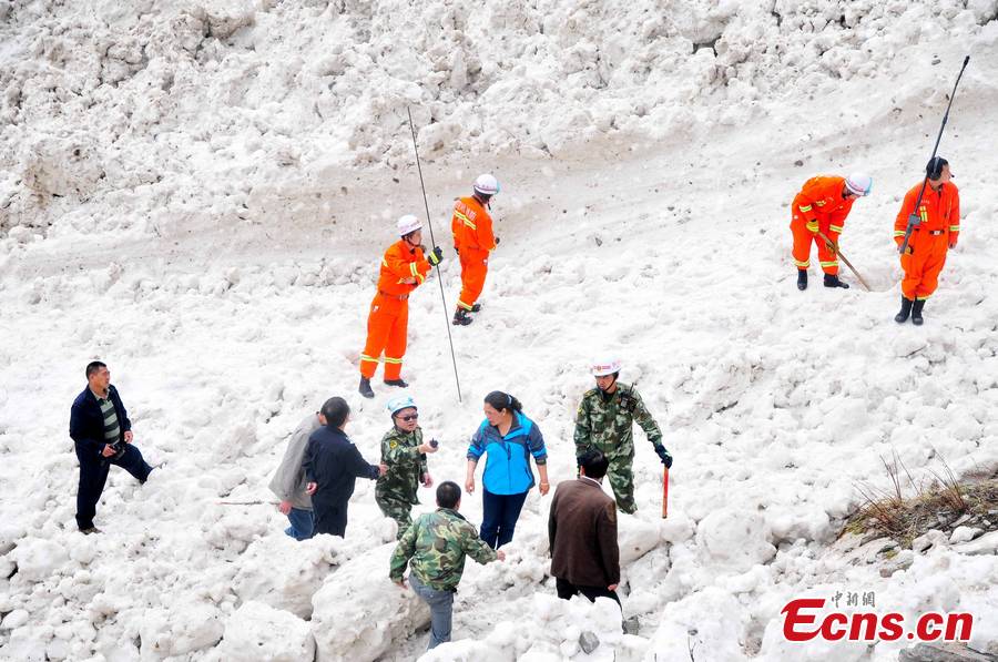 Rescuers search for three missing persons after an avalanche that killed two in Liangtaigou, Aba Tibetan-Qiang Autonomous Prefecture, southwest China's Sichuan Province, May 12, 2013. A total of five locals were buried in the snow when they ventured into the mountains to gather herbs. [CNS Photo/Wang Mingjun]