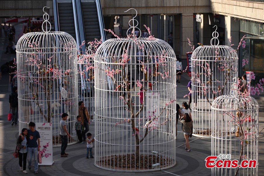 Huge birdcages with artificial flowers, trees and birds inside are displayed to promote environmental protection and green lifestyle at a square in Nanjing, the capital city of East China's Jiangsu Province, May 12, 2013. [Photo: CNS/Yang Bo]