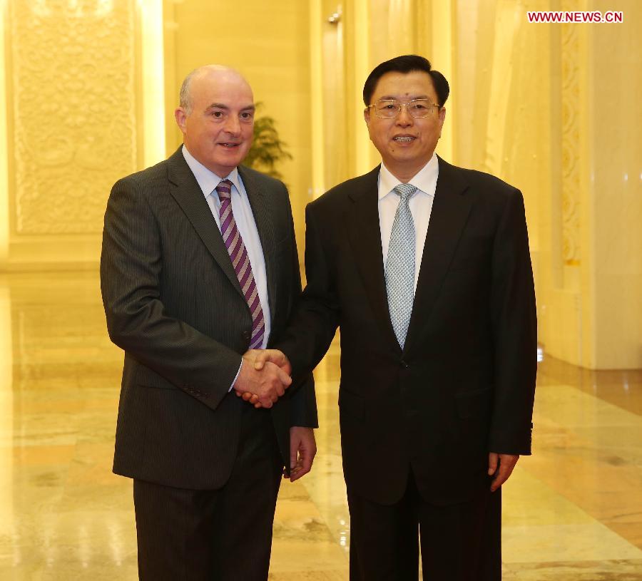 Zhang Dejiang (R), chairman of the Standing Committee of the National People's Congress (NPC) of China, shakes hands with Paddy Burke (L), chairman of Seanad Eireann, Ireland's upper house of parliament, in Beijing, capital of China, May 14, 2013. Zhang Dejiang on Tuesday held talks with visiting Irish parliamentary leaders Sean Barrett and Paddy Burke, chairmen of Dail Eireann and Seanad Eireann, the two houses of Irish parliament. (Xinhua/Liu Weibing)