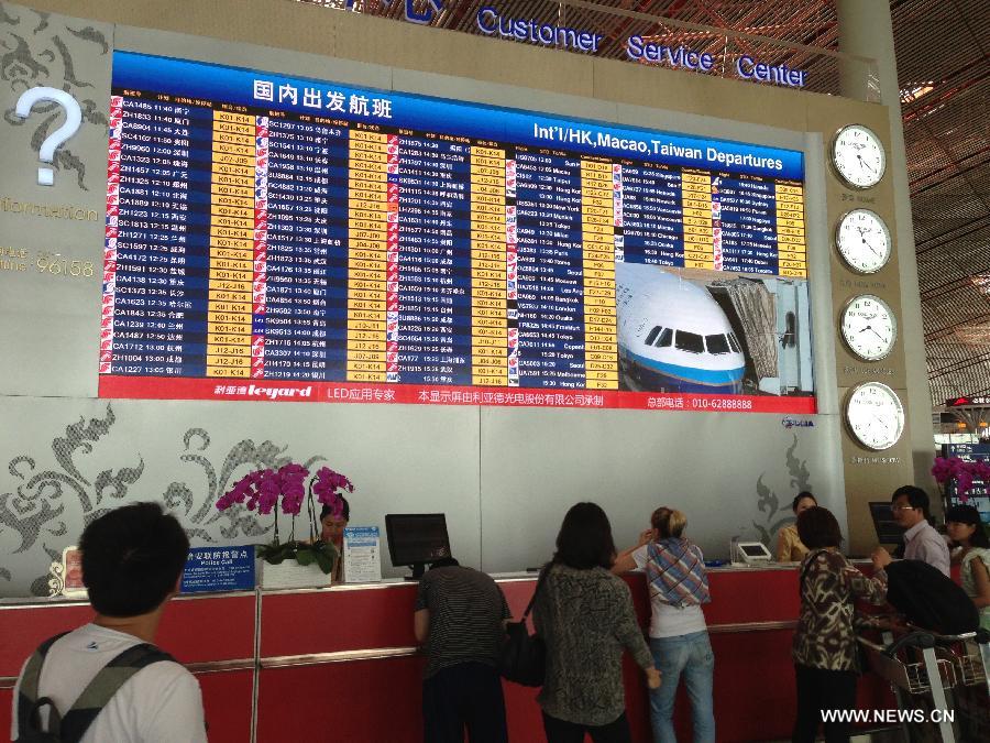Passengers consult information at the Customer Service Center of Capital International Airport in Beijing, capital of China, May 15, 2013. Three Chinese airlines were targeted by false bomb threats Wednesday morning. Five flights operated by China Eastern Airlines, Juneyao Airlines and Shenzhen Airlines were affected. (Xinhua)