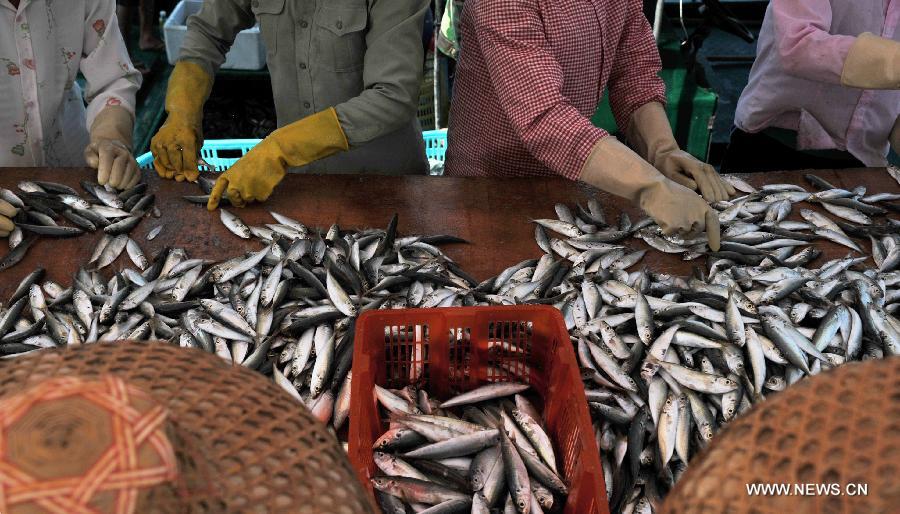 Fisherfolks sort out the last batch of fish before the annual fishing moratorium starts at Gangbei port in Wanning City, south China's Hainan Province, May 16, 2013. The annual fishing moratorium in Hainan lasts from May 16 to Aug. 1 each year. This year marks the 15th year of fishing moratorium here, and in total 9,007 fishing boats as well as 34,780 fisherfolks are involved. (Xinhua/Shi Manke)