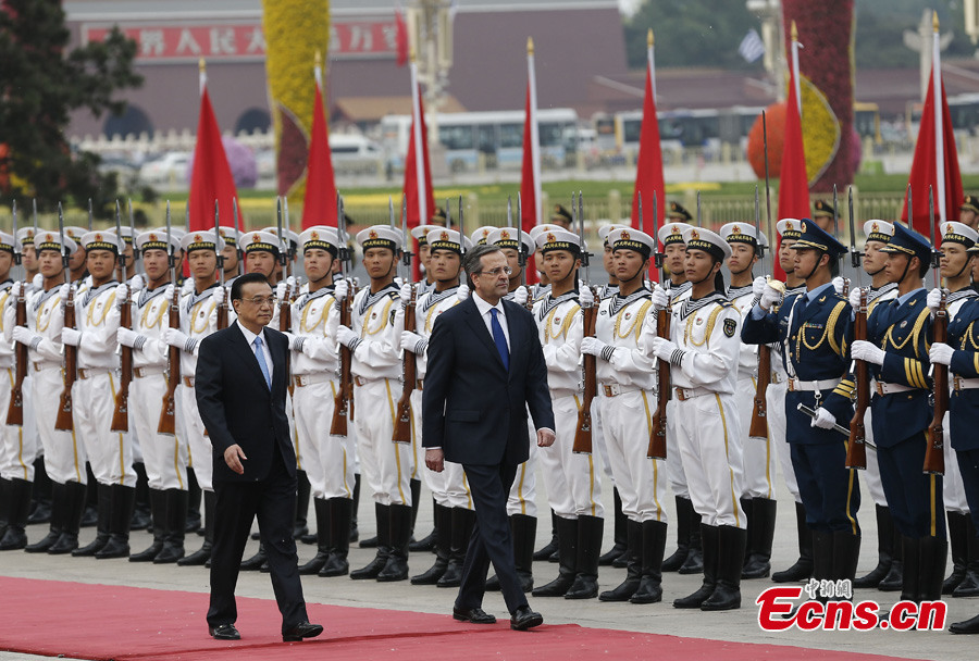 Chinese Premier Li Keqiang (2nd L, front) and visiting Greek Prime Minister Antonis Samaras (R, front) inspect the guard of honor during a welcoming ceremony held before their talks in Beijing, capital of China, May 16, 2013. [Photo: CNS/Du Yang]