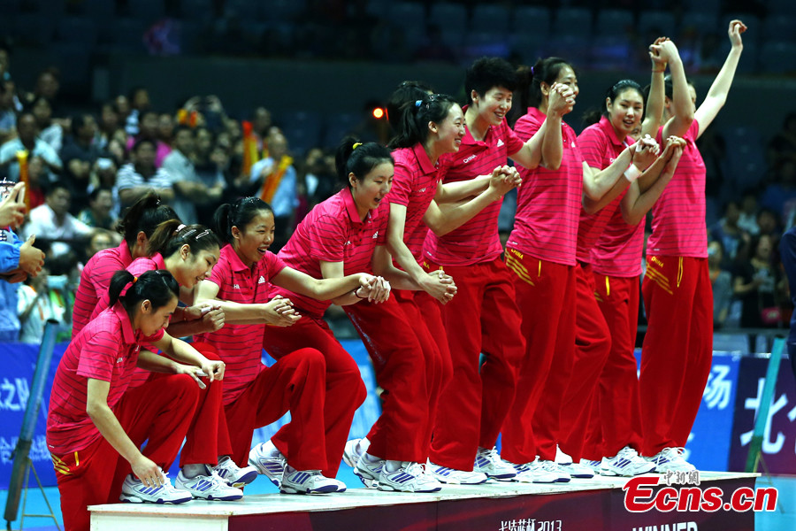 The Chinese women's volleyball team celebrates their victory after beating Puerto Rico in straight sets in Ningbo, Zhejiang Province, May 19, 2013. The Chinese team, which was formed last week, proved a class above their opponents and won the match 25-12, 25-20, 25-14 in just one hour and 11 minutes at the Beilun International Volleyball Tournament. [Photo: CNS/Fu Tian]
