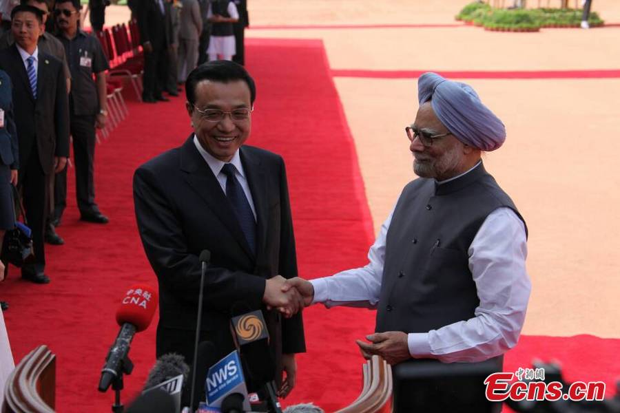 Visiting Chinese Premier Li Keqiang (L) shakes hands with Indian Prime Minister Manmohan Singh during an official welcoming ceremony in New Delhi, capital of India, May 20, 2013. [CNS Photo/Guo Jinchao]