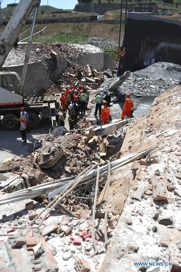 Photo taken on May 20, 2013 shows the accident site where a blast ripped through an explosives manufacturing plant in Caofan Township of Zhangqiu City, east China's Shandong Province. Five people have been confirmed dead in the accident that occurred Monday morning at the plant owned by the Poly Explosives (Jinan) Co., Ltd.. Thirty-four workers were working in the workshop at the time of the accident. Fourteen workers have been pulled out of the site, including five who died. Search and rescue work for all the 20 missing people is under way. (Xinhua/Xu Suhui)