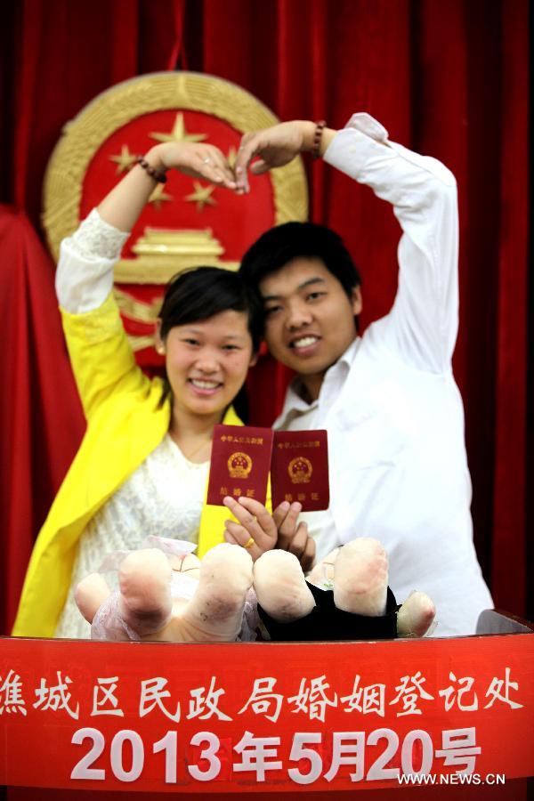 A bride and a bridegroom pose for photos after registering as a married couple at a marriage registry in Jinan City, east China's Shandong Province, May 20, 2013. As the pronunciation of the date number "520" sounds similiar to "I love you" in Chinese, many people chose to register as couples on Monday. (Xinhua/Zhao Xiaoming)