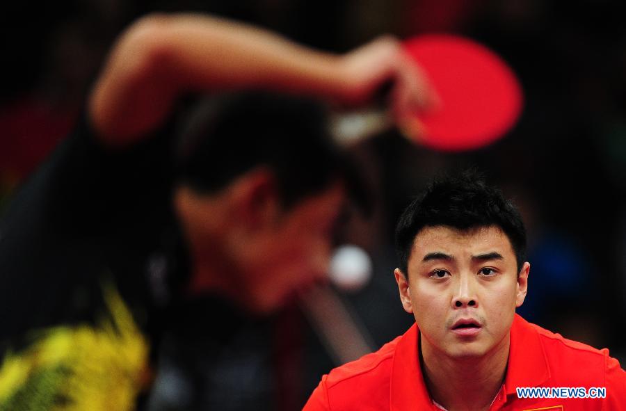 Zhang Jike (L) of China competes during the final of men's singles against his teammate Wang Hao in the 2013 World Table Tennis Championships in Paris, France on May 20, 2013. Zhang won 4-2 to claim the title. (Xinhua/Tao Xiyi)