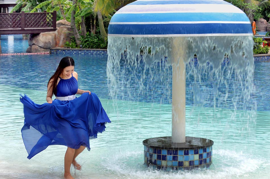 A visitor plays in a thermal spring swimming pool on May 18, 2013 at Guanlan Lake Holiday Resort in Haikou city, Hainan province. (Photo/Xinhua)