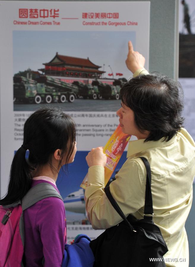 People view pictures at a photo exhibition named "China Dream-Beautiful China" in New York, the United States, May 20, 2013. (Xinhua/Wang Lei)