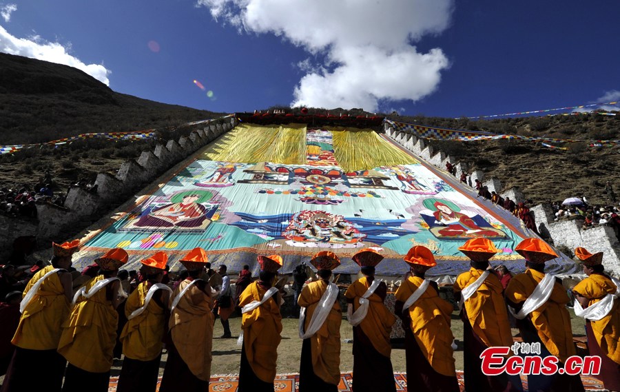 Lamas unfold a huge thangka, a painting on silk with embroidery, at Tsurphu Monastery in Tibet Autonomous Region, May 21, 2013. The Thangka Festival was held on Tuesday, attracting many believers to the monastery to pray, get blessed and appreciate the big and vividly woven thangka. Tsurphu Monastery is the most important monastery of the Karma Kagyu lineage, which is probably the largest and certainly the most widely practiced lineage within the Kagyu school, one of the four major schools of Tibetan Buddhism. [Photo: CNS/Li Lin]