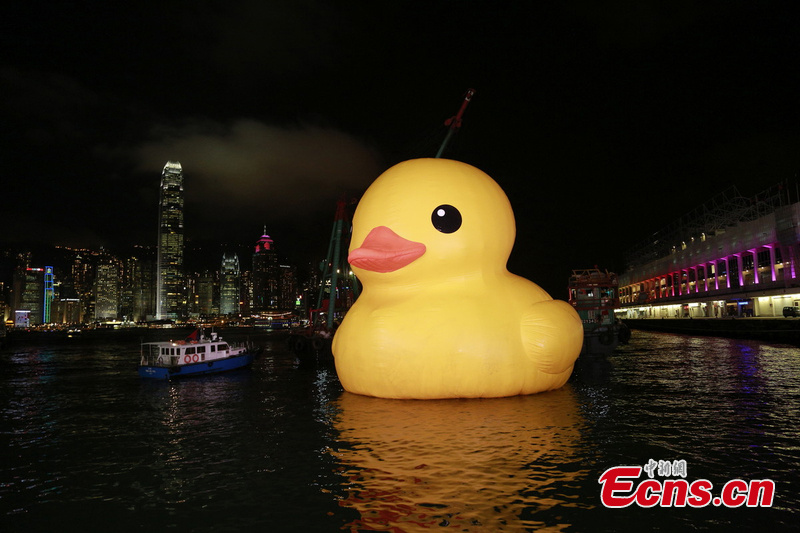 The giant inflatable rubber duck returns to Victoria Harbour, Hong Kong, May 21, 2013. It was abruptly deflated for maintenance for almost a week. The 16.5-meter-tall duck, conceived by Dutch artist Florentijn Hofman, sailed into the harbor on May 2 to cheer crowds. [Photo: IC Press]