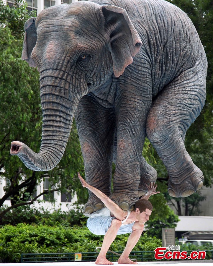 A 5-meter-high sculpture is on display in Statue Square, Hong Kong, May 21, 2013. The artwork "Pentateuque," brings to real life the fantastical and seemingly impossible act of an average man balancing a gigantic elephant, modelled on one at the Singapore Zoo, atop his back, which is actually a cast of the artist himself. [Photo: CNS/Hong Shaokui]