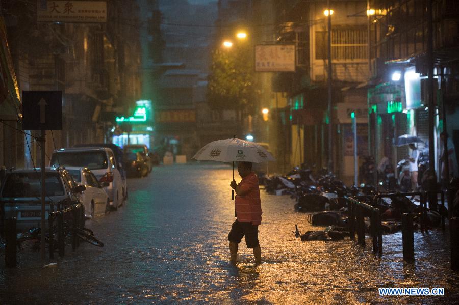 A pedestrian walks in rain on a waterlogged road in Macao, south China, May 22, 2013. (Xinhua/Cheong Kam Ka)