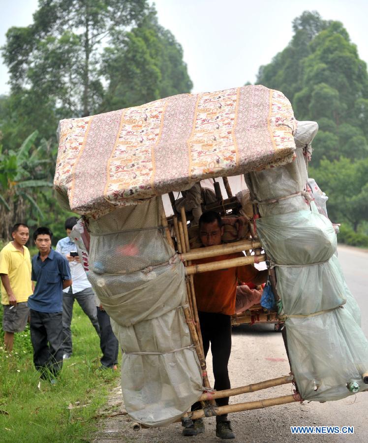 Liu Lingchao carries his "moving hut" on a road in Liucheng County of Liuzhou City, south China's Guangxi Zhuang Autonomous Region, May 21, 2013. Liu, a 38-year-old migrant worker from Liuzhou's Rong'an County, decided to make a "moving hut" five years ago in Guangdong Province to live in on his way to Rong'an, his hometown. The hut measures about 60 kilograms in weight, 1.5 meters in length and 2.2 meters in height. Since then, Liu has been carrying a hut and making a living by collecting rubbishes along the way. Having worn out three such huts, now he is only about 20 kilometers away from home. (Xinhua/Li Hanchi)