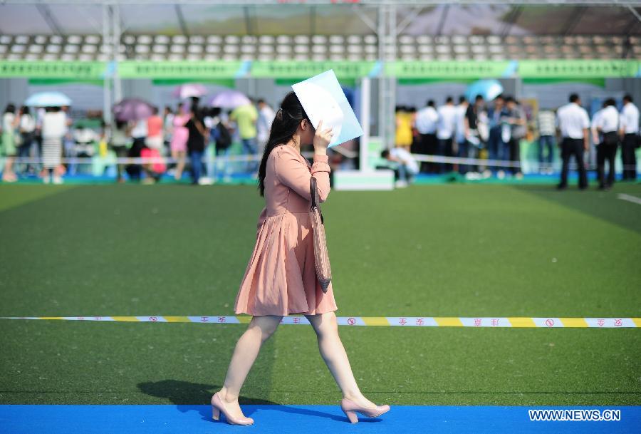 An applicant walks in a job fair in Guizhou University of Finance and Economics in Guiyang, capital of southwest China's Guizhou Province, May 23, 2013. China will see a record-high 6.99 million people graduate from college this year, up 2.8 percent year on year, according to official figures. (Xinhua/Liu Xu)